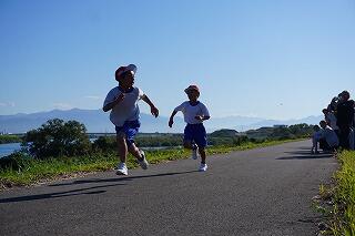川と山が織りなす景色をバックに、本校付近の堤防の上を、児童たちは、低学年約1.4Km、中学年約2Km、高学年2.5Kmを完走しました。