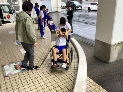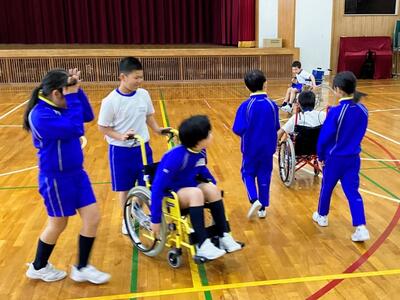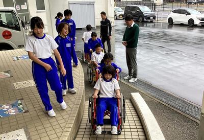 10月31日(金)の総合的な学習の時間に、車椅子体験を行いました。自分たちが思っていた以上に車いすの操作が難しかったり、少しの段差でも障壁になったりすることに気づきました。サポートする友達は、優しく声かけをしていました。