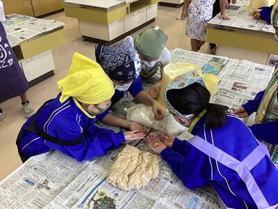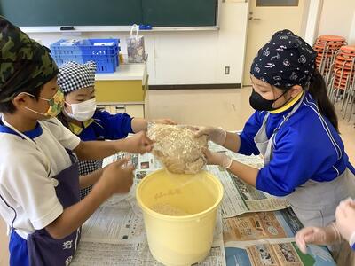 10月28日(火)の5・6時間目に、米五から講師をお招きして、みそ造りを体験しました。米こうじの感触や大豆の匂いなどを楽しみながら、大豆がみそになる過程を学習しました。
