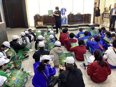 福井市体育館で昼食をとった後、体育館フロアでレクレーションを行い、他校の児童と交流を深めました。