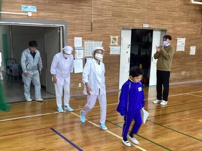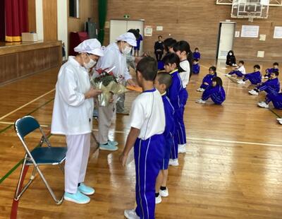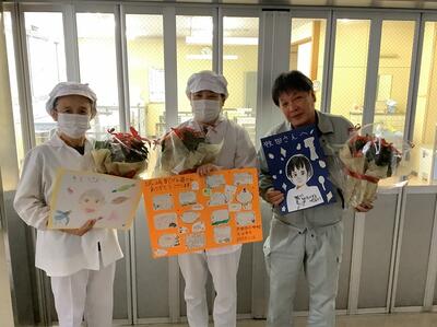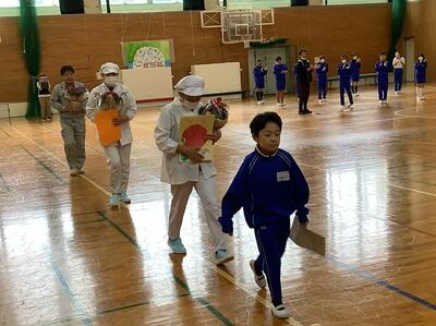 代表の児童からは、「配膳員さんたちは、いつもおいしい給食を運んでくださり、ありがとうございます。施設技師さんは、私たちが知らない間に学校の中のいろいろな修理をしてくださり、ありがとうございます。これからも、おいしい給食が食べられること、そして安全に学校生活が送られることに感謝して、給食を残さずきれいに食べて、物を大切にしていきましょう。」とあいさつがありました。
